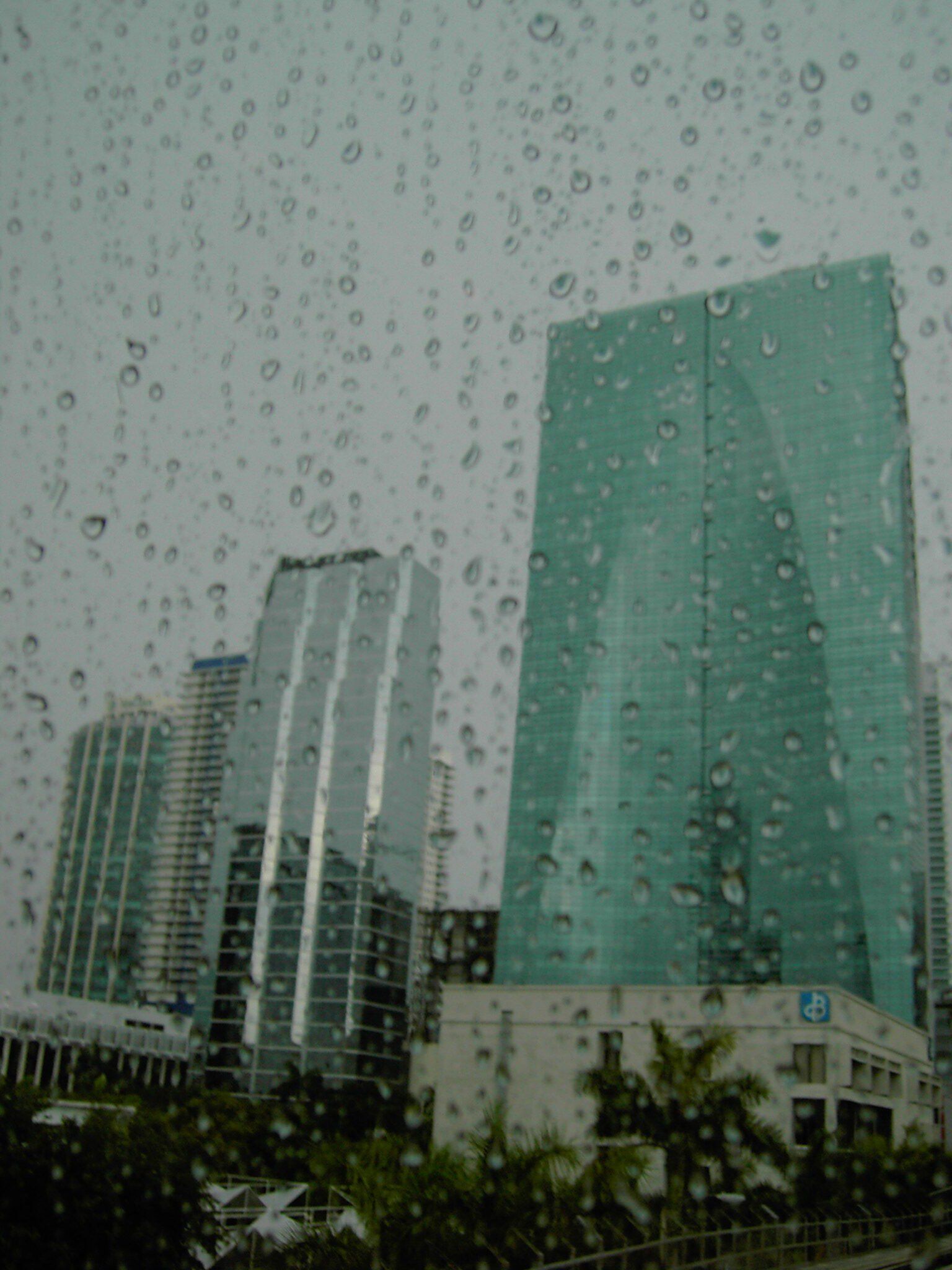 Von der Bayside aus machen wir eine kostenlose Rundfahrt mit dem Metromover, einer automatischen Bahn, die mehrere Viertel der Stadt verbindet. Während der Fahrt regnet es (zum ersten Mal während des Urlaubs), so dass wir die Wolkenkratzer mal anders sehen, so oft kommt das ja hier nicht vor...