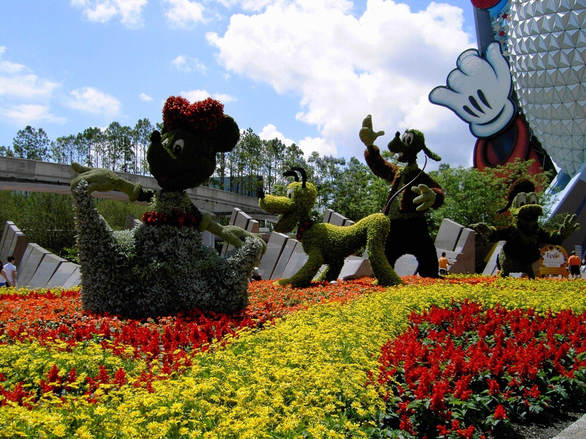 Direkt nach dem Eingang erwarten uns Mickey Mouse und Co. aber doch! Für uns deutlich attraktiver ist aber die riesige Kugel des "Spaceship Earth" dahinter. Dort reisen wir - im wahrsten Sinn des Wortes, nämlich in einer Bahn - durch die Entwicklungsgeschichte der menschlichen Kommunikation*. Anschließend sehen wir auf unserem Rundgang weitere Pavillons wie "The Living Seas" und Attraktionen wie den Musikbrunnen "Fountain of Nations".