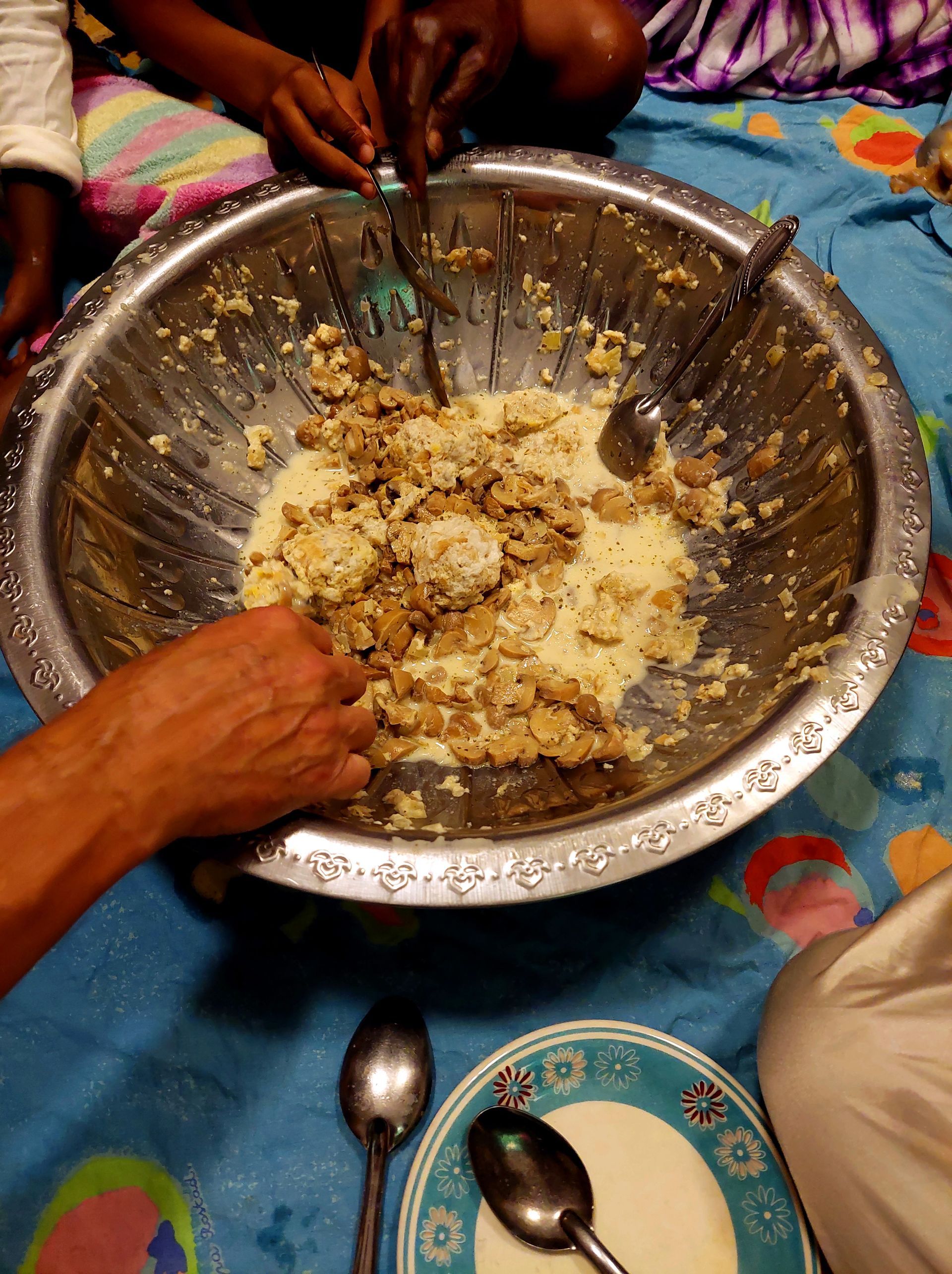In Sukuta heißt es dann für mich kochen, während das Geburtstagskind Snooker* schauen kann. Außerdem beschäftigt die kleine Aisha ihren geliebten "Uncle", damit der nicht auf die Idee kommt, im Hinterhof nachzuschauen, was dort gekocht wird. Trotz der doch ungewohnten Umstände schaffe ich es, Rahmschwammerl mit Semmelknödeln hinzubringen. Die Überraschung für Christian ist perfekt - er hätte mit vielem gerechnet, aber damit sicher nicht! Und auch unserer gambischen Familie schmeckt das für sie doch sehr exotische Gericht.