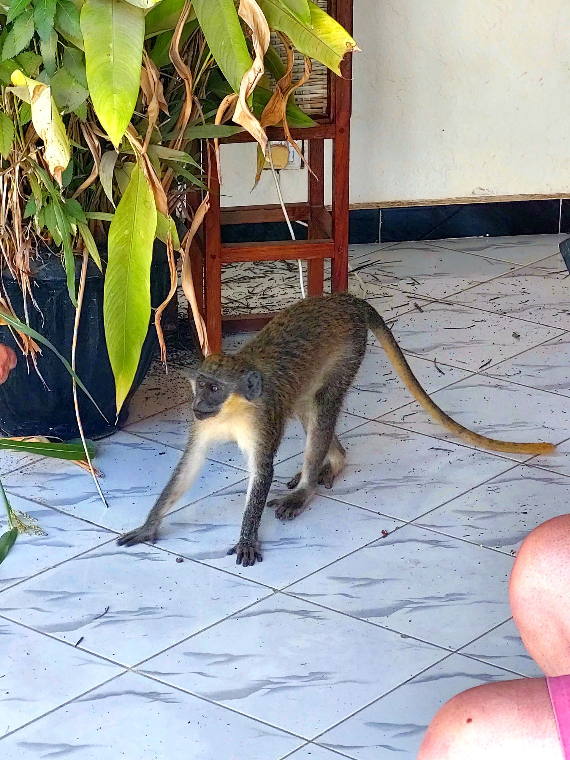 Am Vormittag stattet eine einzelne Meerkatze der Lodge einen Besuch ab und bedient sich an den Erdnüssen, die eigentlich für die Vögel gedacht sind - und so routiniert, wie der Affe den Spender öffnet, macht er das auch nicht zum ersten Mal...