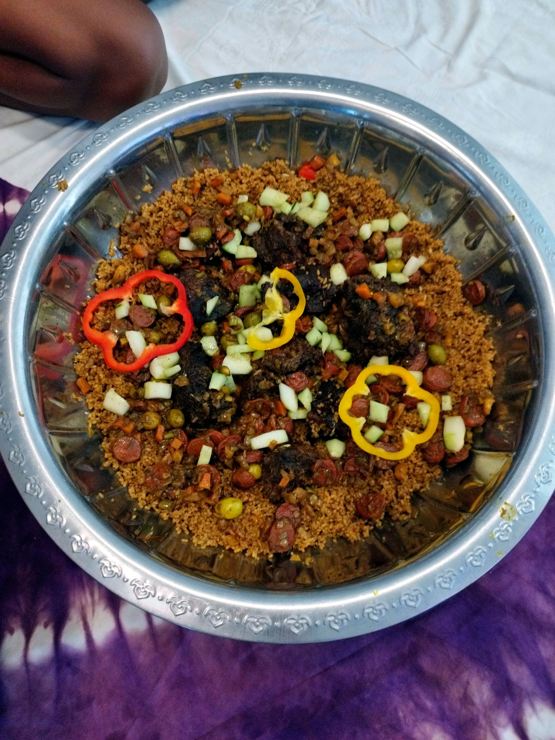 Zum Essen gibt es dann Benachin, das traditionelle Wolof*-Gericht, es schmeckt scharf und super lecker. Natürlich essen wir alle zusammen auf dem Boden.