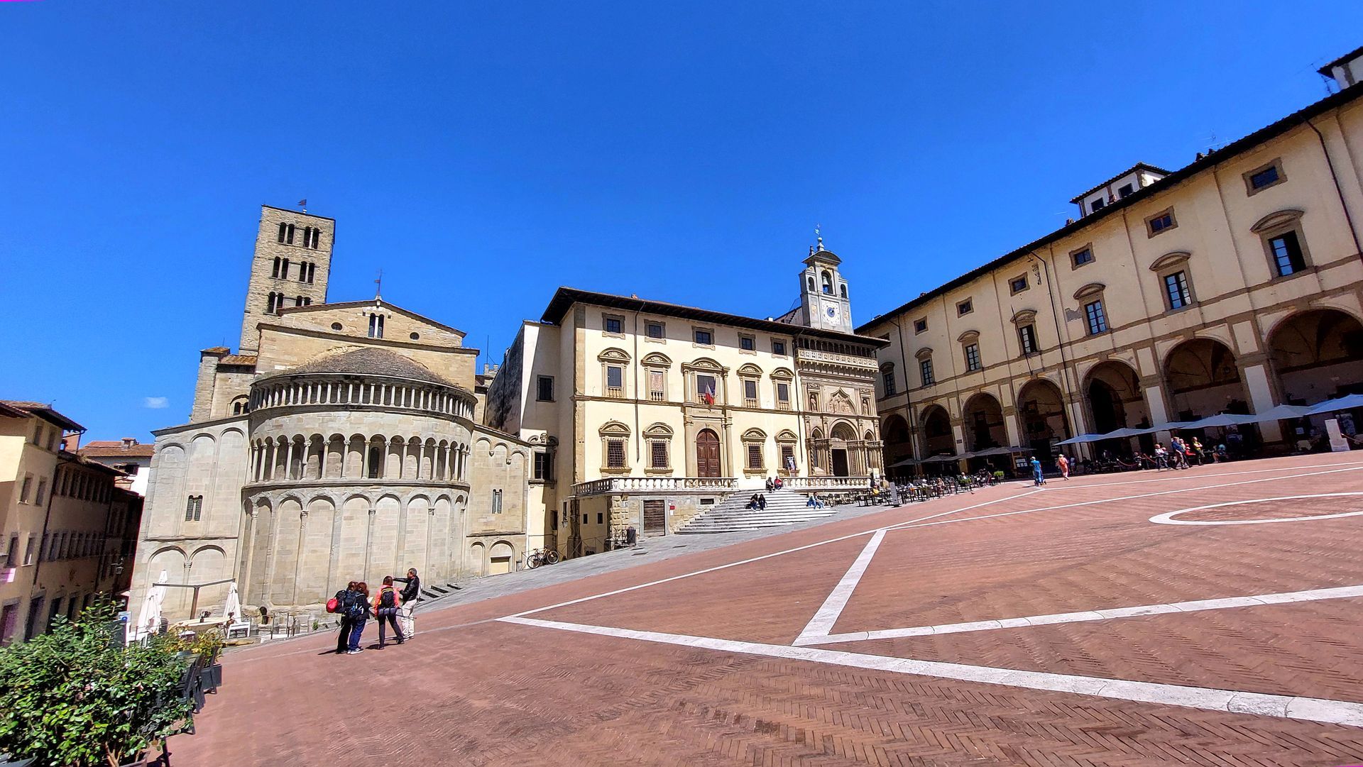 Unser erstes Ziel ist der gotische Dom San Donato mit seinen berühmten Glasfenstern und dem reich mit Reliefs* verzierten Altar. Durch den Park spazieren wir zur Medici*-Festung und besichtigen das beeindruckende Bauwerk. Von hier aus ist es nur ein kurzer Spaziergang zur Piazza Grande, dem Herz der Altstadt - und aus unserer Sicht einer der schönsten Plätze der Toskana mit den von Vasari* entworfenen Loggien*, den mittelalterlichen Häusern und den schönen Palazzi*. Wir trinken etwas und lassen uns die kleinen Häppchen schmecken, die wir zum Bier gratis serviert bekommen.