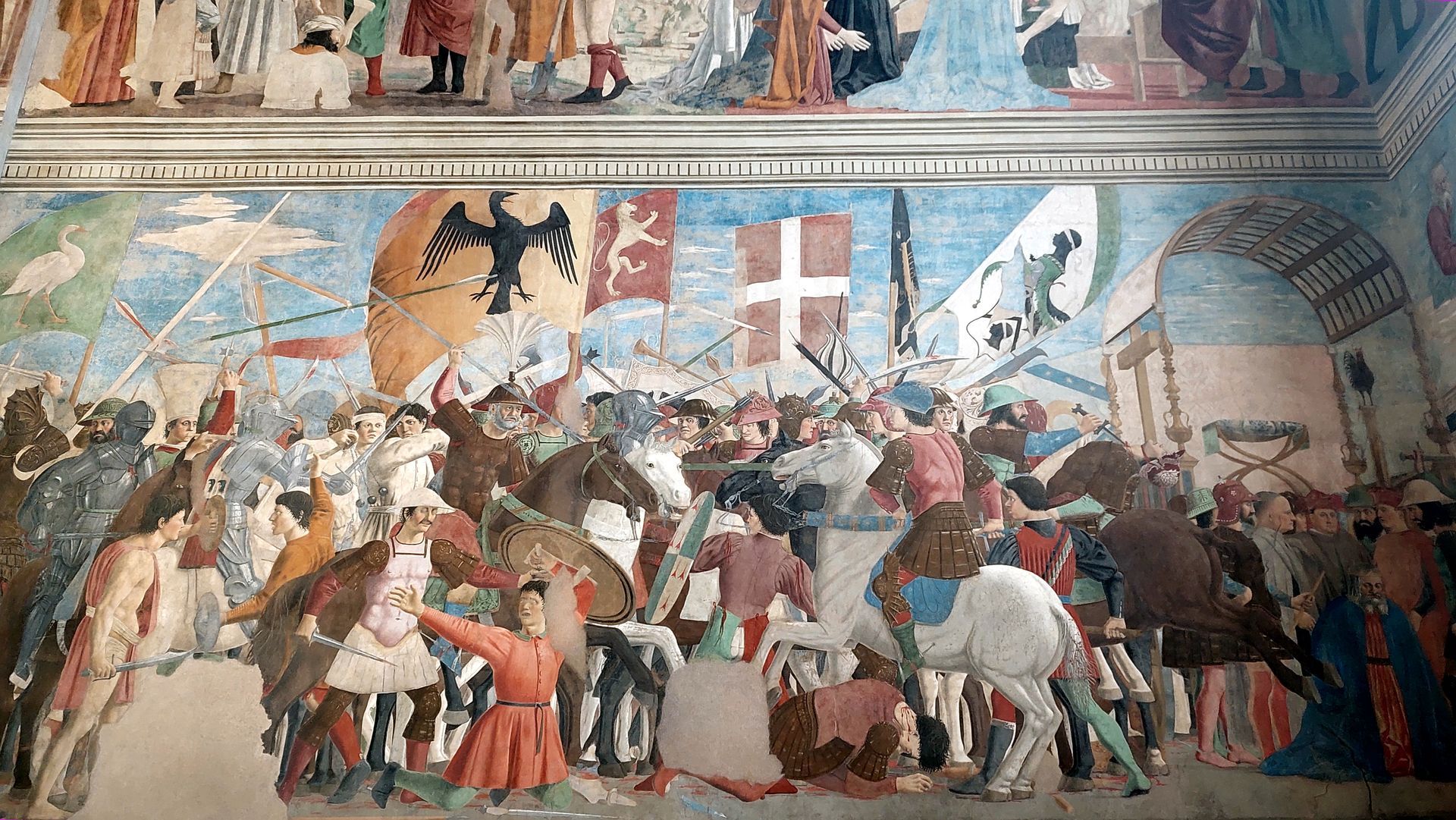 Den größten Kunstschatz der Stadt, den berühmten Freskenzyklus* von Piero della Francesca* in der Kirche San Francesco, können wir dank meines Behindertenausweises sogar beide gratis besuchen. Bis wir in die Kirche dürfen (der Einlass ist begrenzt, deshalb müssen wir eine gute halbe Stunde warten), trinken wir noch etwas. Die Darstellung der "Legende vom Heiligen Kreuz" ist einmalig schön und gilt zu Recht als einer der bedeutendsten Kunstschätze der Toskana. Nach einem leckeren Mittagessen spazieren wir noch zur Kirche San Domenico, wo wir das bekannte Frühwerk Cimabues*, ein Kreuz aus dem Jahr 1260, bewundern.