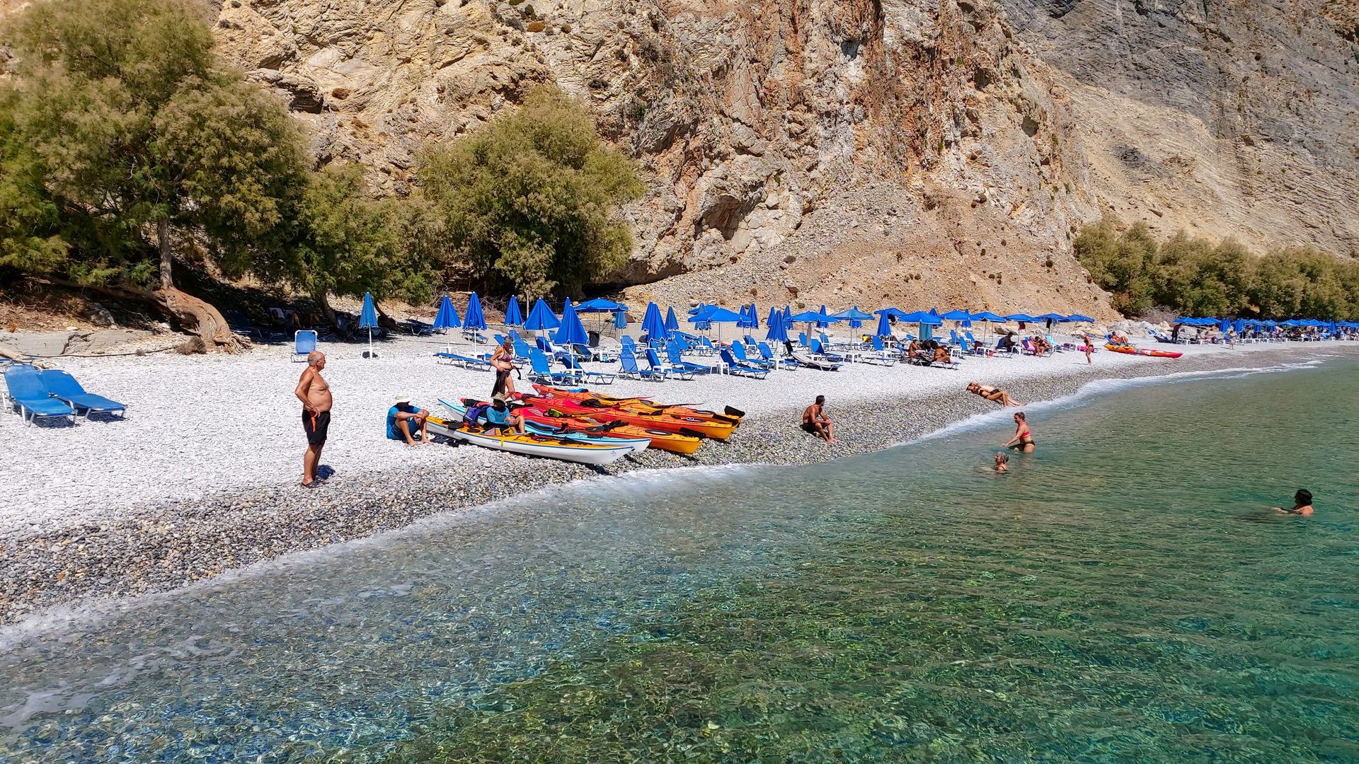 Die Bucht ist wirklich beeindruckend mit dem hellen Kies, dem glasklaren Wasser und den steilen Felswänden! Wir sichern uns einen Sonnenschirm mit Liegen, genießen das traumhafte Wetter, gehen mehrmals zum Schnorcheln und essen in der kleinen Taverne am Bootsanleger lecker zu Mittag.