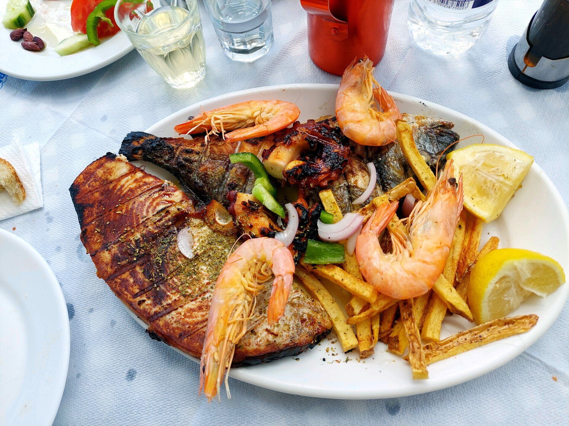 Anschließend gehen wir zurück in die Taverne, wo wir vorher waren, und essen dort super leckeres Grillfleisch, gegrilltes Gemüse und handgeschnittene Pommes - aber es ist so viel, dass wir uns den Rest einpacken lassen müssen...