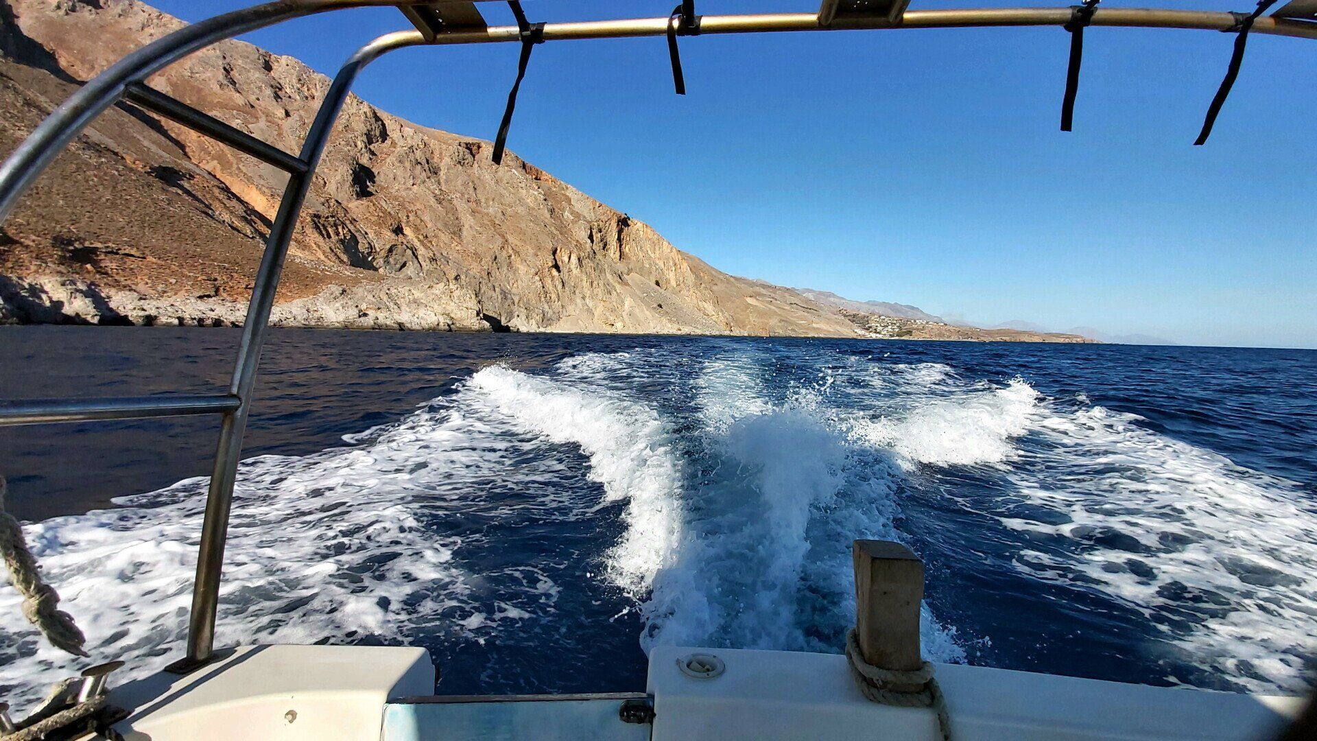 Um 10:30 Uhr fahren wir mit Kostas (dem Bruder von Pavlos) mit dem Boot nach Loutró und von dort mit dem Linienboot zum Strand.