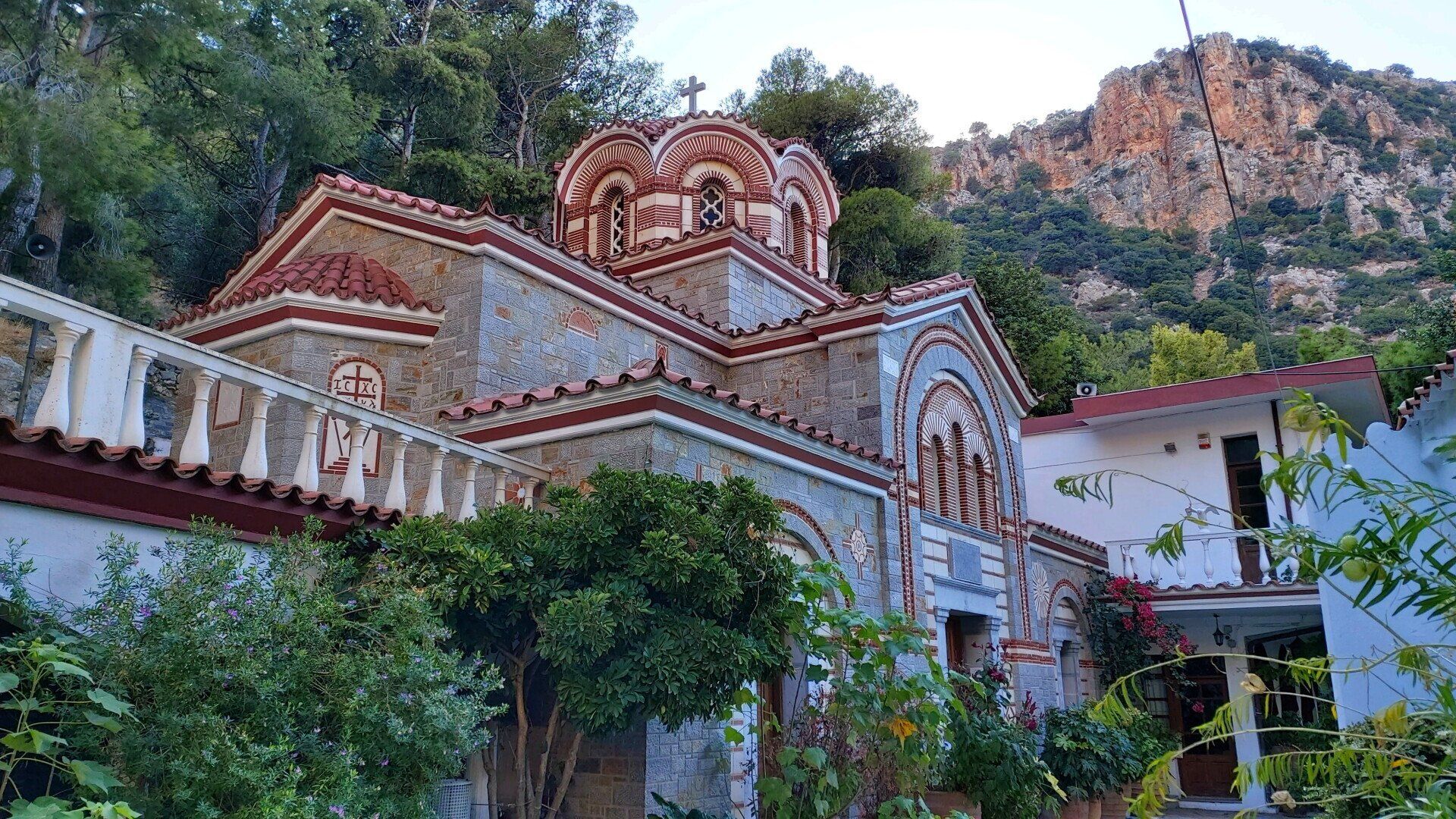 Kurz hinter Neápolis fahren wir direkt am Kloster Kremasta vorbei und beschließen spontan, es auch anzuschauen. Kremasta ist das erste (und einzige) Nonnenkloster, das wir hier sehen. Eine junge Nonne empfängt uns trotz der frühen Stunde sehr freundlich und führt uns herum. Außer in der wunderschönen Klosterkirche dürfen wir auch überall fotografieren. Im kleinen Klosterladen kaufen wir noch ein paar Mitbringsel für die Lieben daheim.
